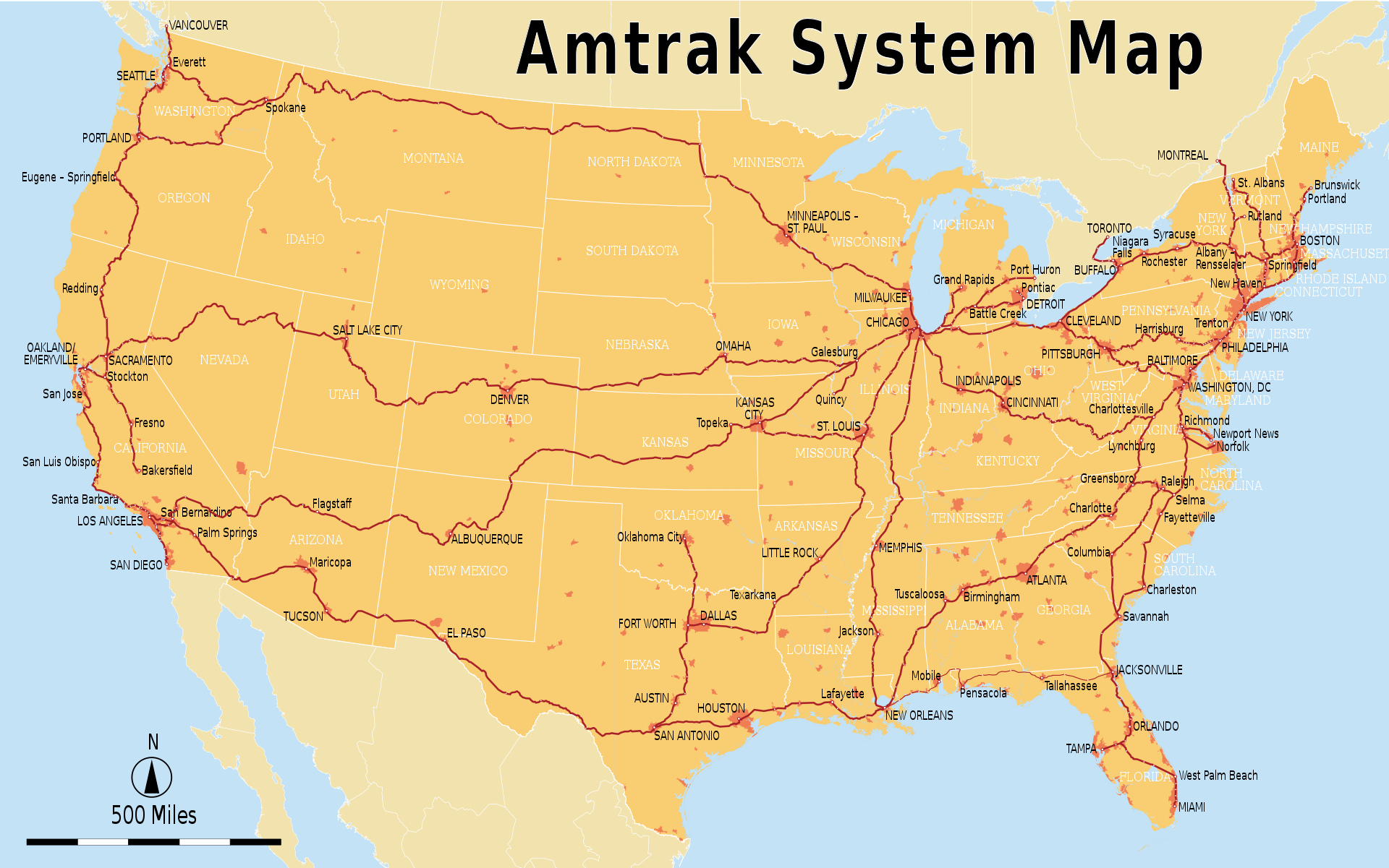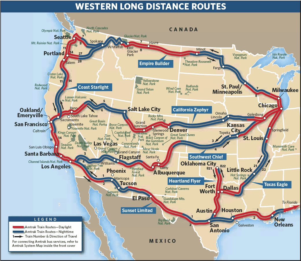 Amtrak, the primary and really only train service in the U.S., goes pretty much anywhere you could want to go in this big, beautiful country. The biggest exceptions would be in the Northern Great Plains/Mountain West, which doesn’t have train service in the states of Wyoming and South Dakota. Also, due to the vast unpopulated areas of the West there is quite a gap between Amtrak’s main lines, leaving many areas without train service. There are special ‘‘vacation trains’’ that will get you to many of the ‘‘must-see’’ National Parks that are scattered throughout the Northern Great Plains/Mountain West, like Yellowstone, Grand Teton, Yosemite, and we’ll show you how to access these a bit later on.